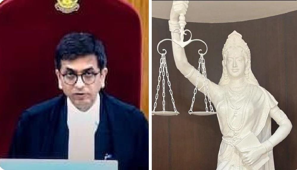 न्याय की देवी की आंखों से पट्टी हटा दी गई है और उनके हाथ में तलवार की जगह संविधान की एक प्रति रखी गई है।
